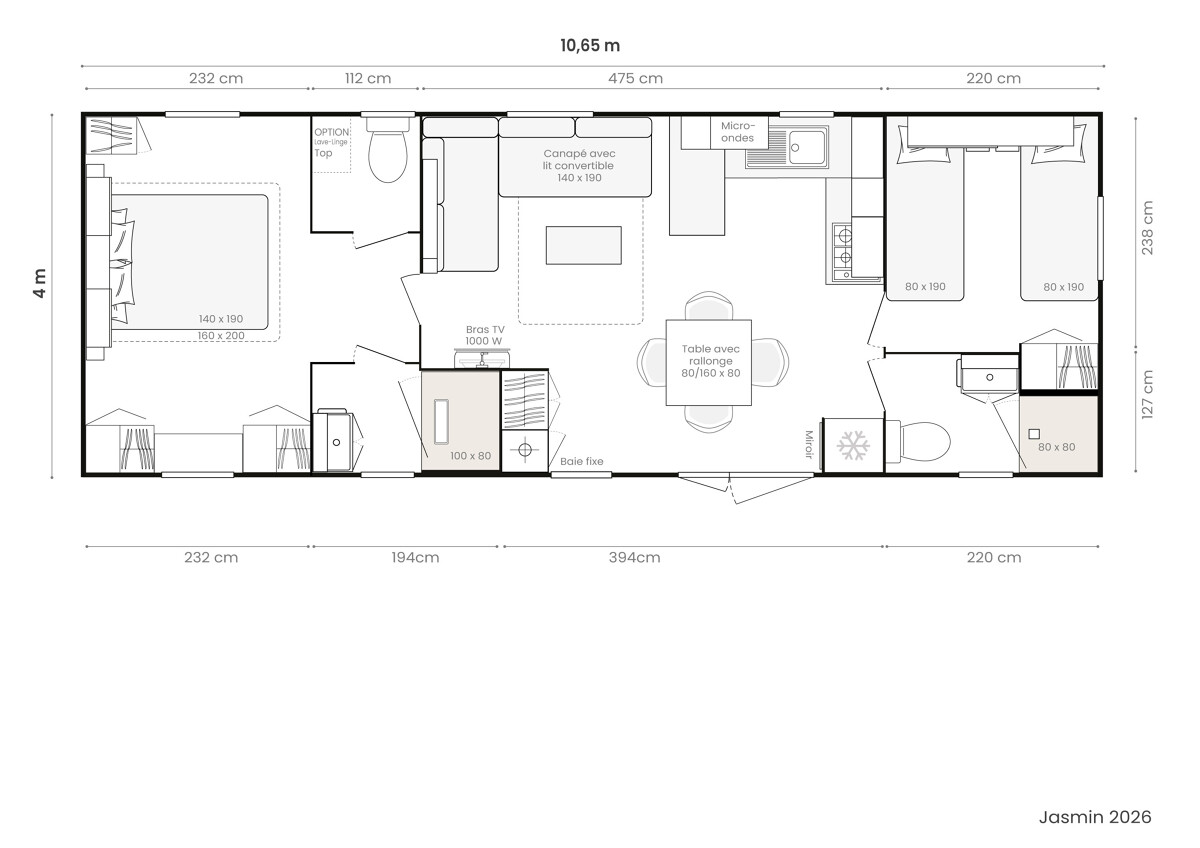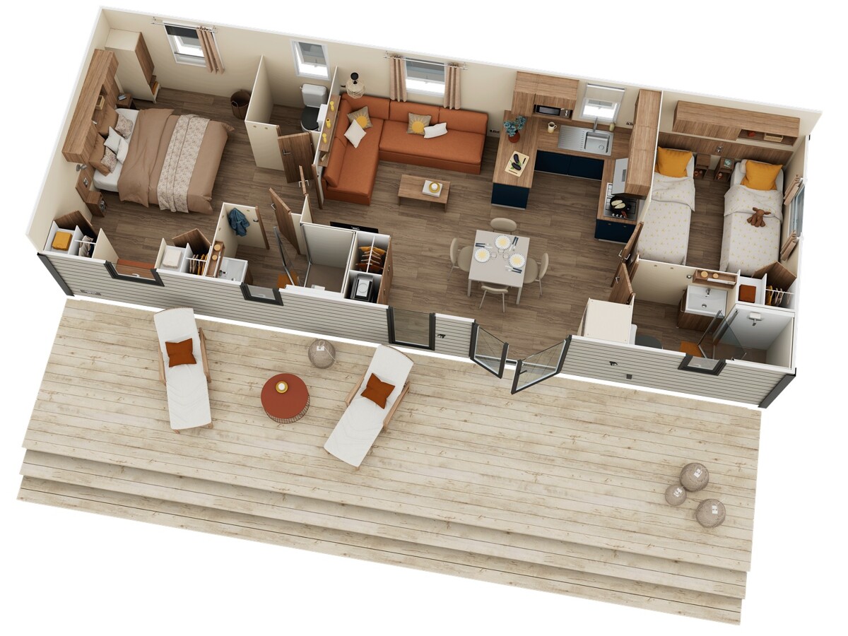 Ce mobil-home spacieux et confortable est parfait pour passer des vacances en toute tranquillité. Il dispose de deux chambres accueillantes, offrant intimité et confort pour chacun.