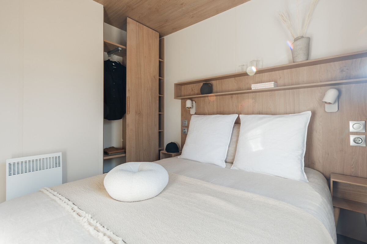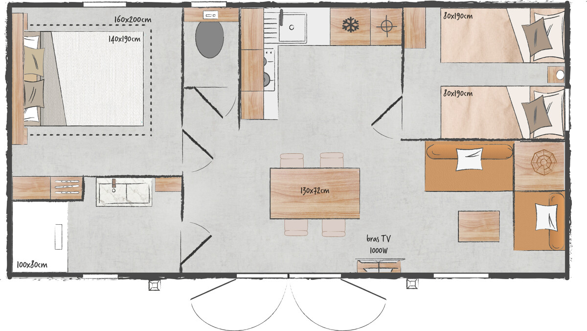 Ce mobil-home 2 chambres, 1 salle de bain offre un espace de vie chaleureux et fonctionnel, parfaitement pensé pour le confort de tous. La pièce principale, lumineuse et conviviale, regroupe cuisine et séjour, tandis que les chambres offrent intimité et calme.